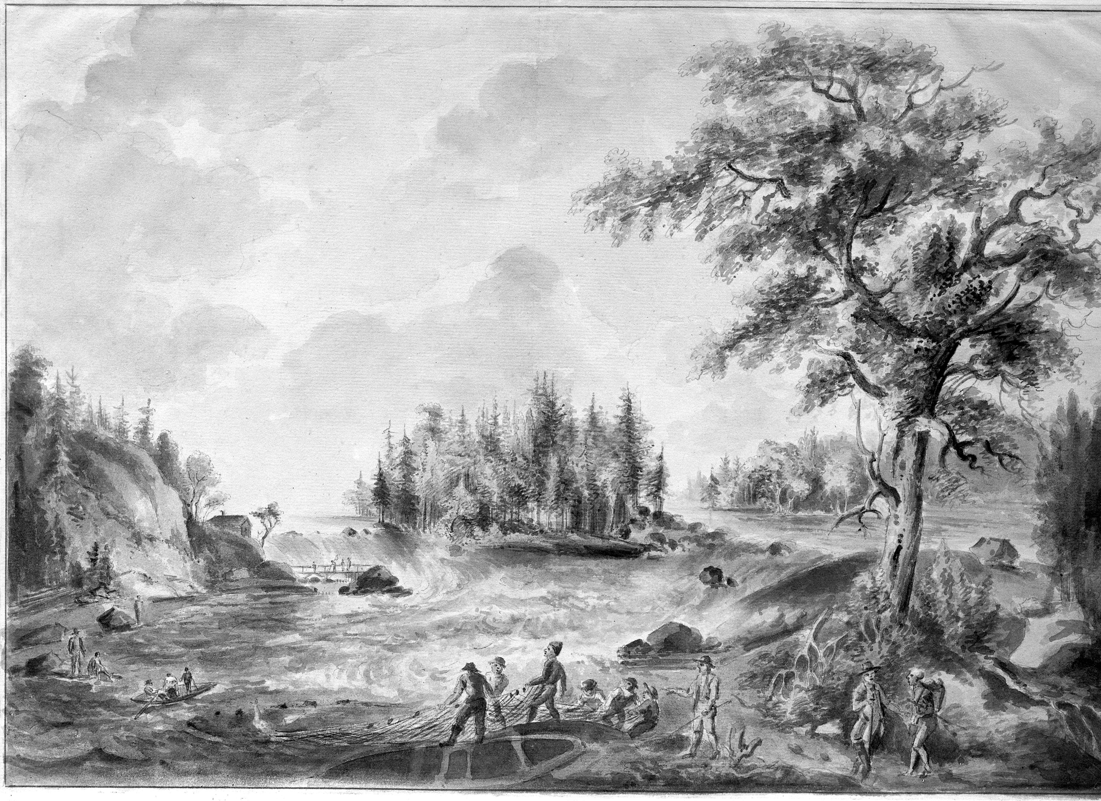 Nätfiske vid Älvkarlebyfallen. Rosenhanska samlingarna. "Ups 92:a". Akvarellerad pennteckning av Elias Martin från 1798