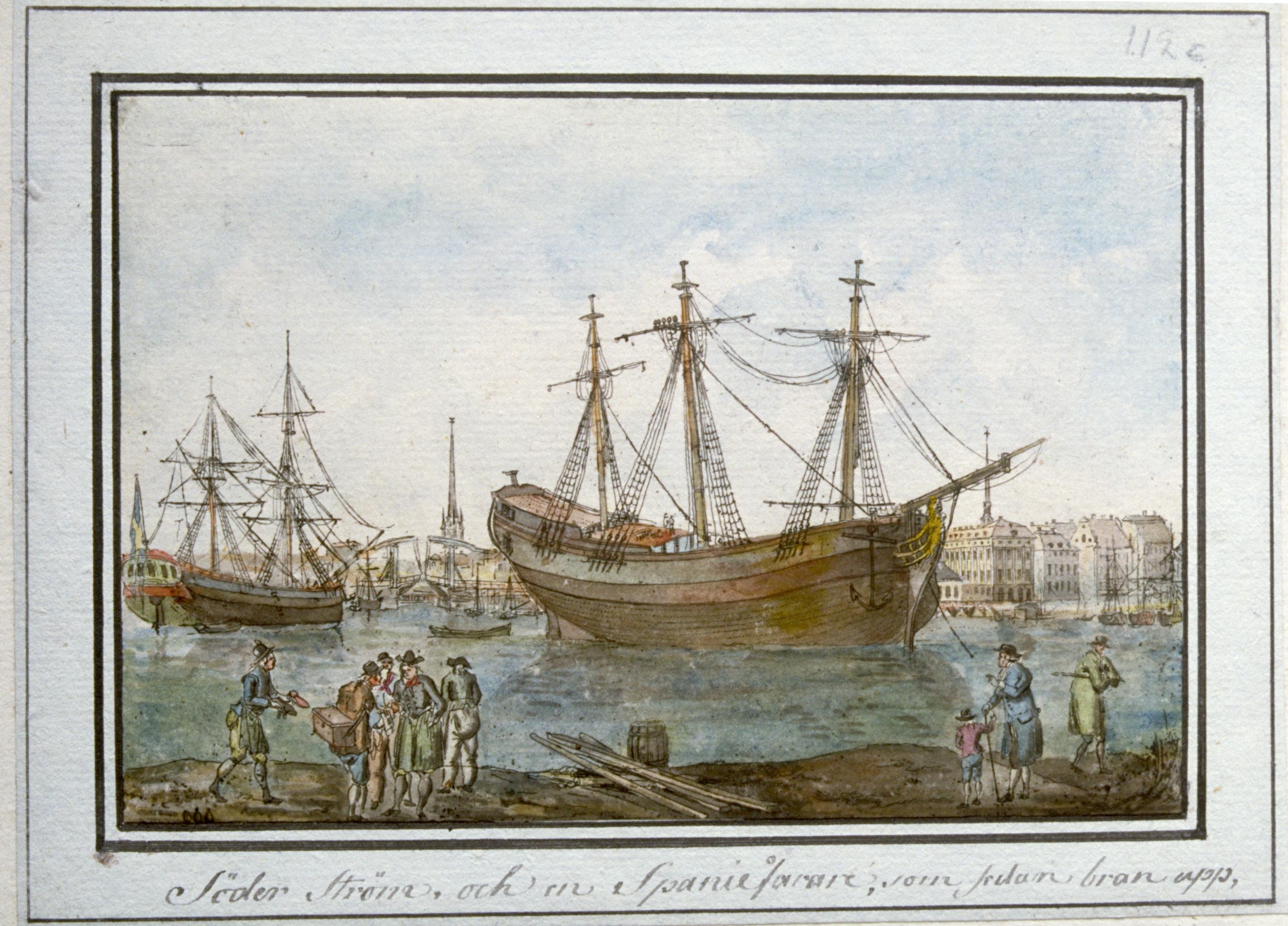 Utsikt från Söder Mälarstrand mot Gamla stan och Riddarholmen. Akvarellerad konturetsning av Elias Martin, från 1790-talet.