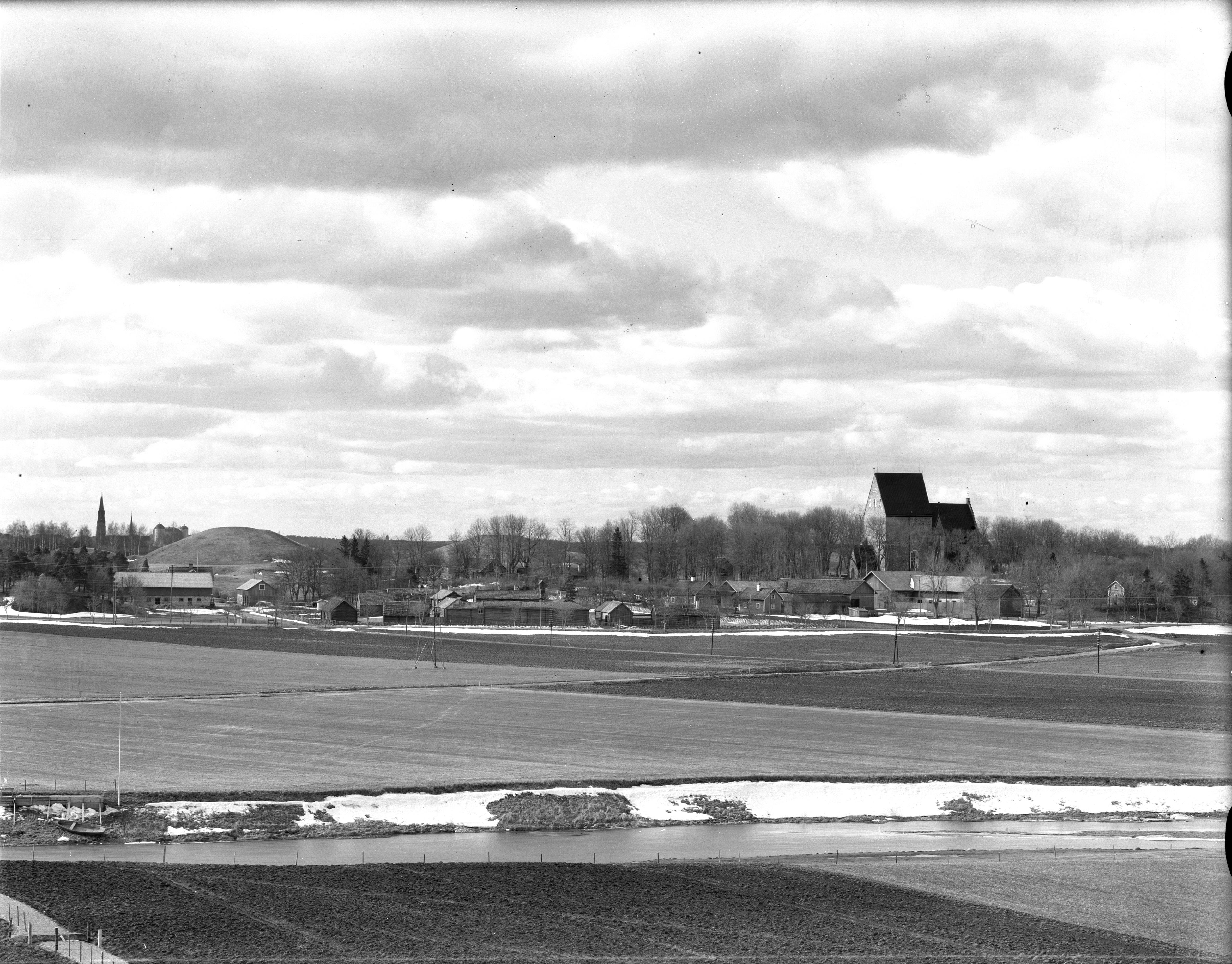 Gamla Uppsala kyrka med högarna till vänster. Bilden tagen på 1940-talet.