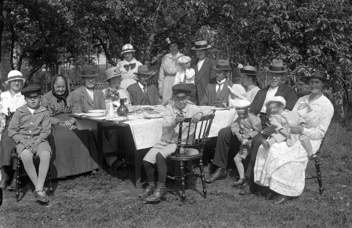 Åsmundshyttan 5:4, "Erik-Daniels". Stående från vänster Elsa Åsberg-Kling, Edit Åsberg-Norling, Olga Charlotta Åsberg f. 4 december 1888 d. 9 mars 1929. Sittande från vänster Karin Jansdotter f. 21 december 1847 d. 22 september 1925, Anders Olson-Åsberg f. 19 mars 1849 d. 12 augusti 1924, Anna Johansson f. 15 september 1888, Karl Johansson, Lars Gustav Åsberg f. 28 juli 1880 d. 28 november 1960, Johan Johansson, Tea Johansson, Birger Pfeifer f. 8 september 1860, Andrea Pfeifer f. 10 januari 1884. Karl och Johan är bröder. Karin och Anders, Anna och Karl, Olga och Lars, Johan och Tea är gifta par.