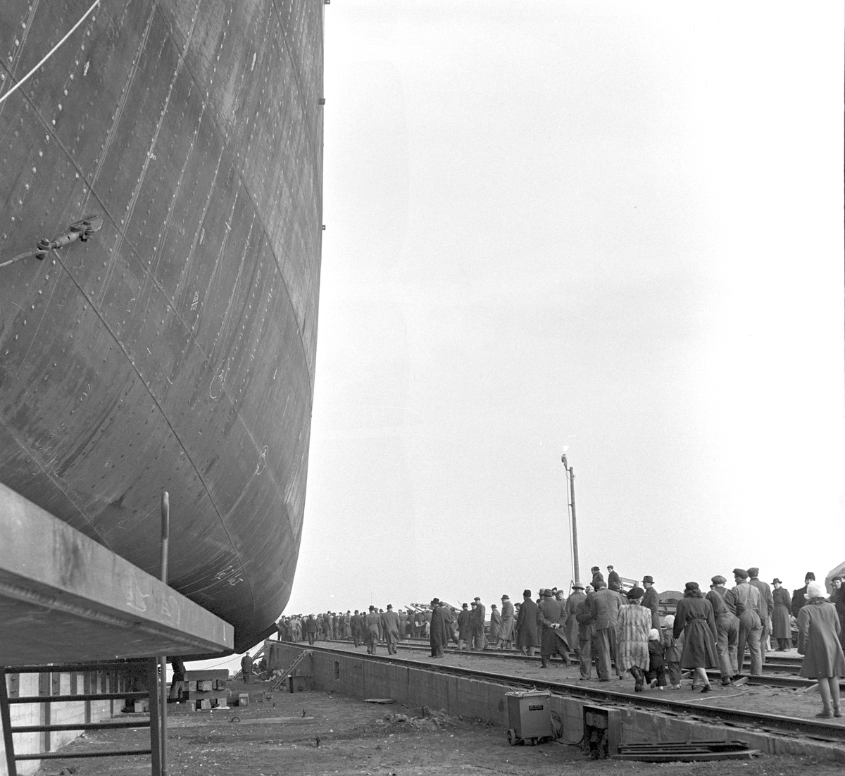 Stapelavlöpning. Den 19 februari 1949. Gävle Varv anlades 1873. Efter en konkurs 1921 bildades Gefle Varfvs och Verkstads Nya AB, som bland annat tillverkade oljecisterner och utrustningar till pappersmassefabriker. På 1940-talet återupptogs skeppsbyggeriet.