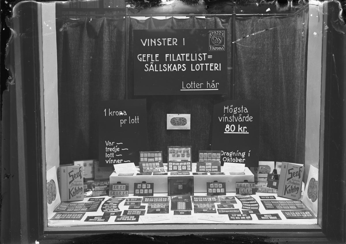 Gefle Filatelisällskap. Skyltfönster (frimärkslotteri). Foto 1930-tal.