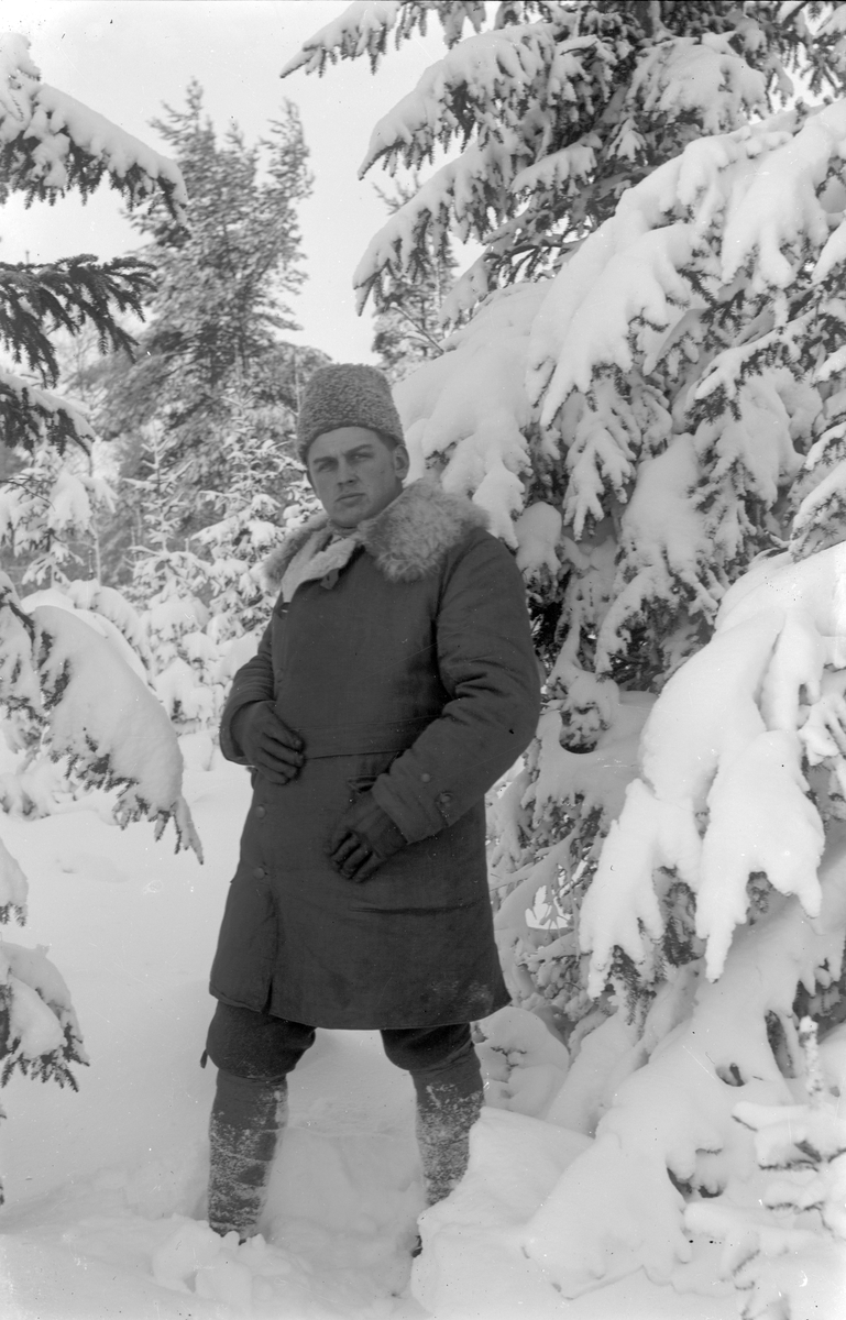 Man i vinterkläder i skogen.