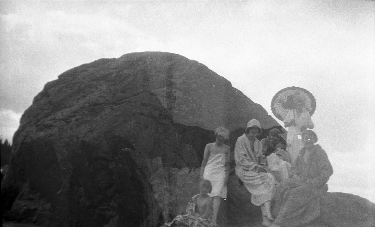 Badscen från Rullsand vid Brämen. Från vänster Lilian Holmstedt, arrendatorns dotter Eva Lundberg, Anna Larsson, Elna Brundin och hennes döttrar. Foto 1927.