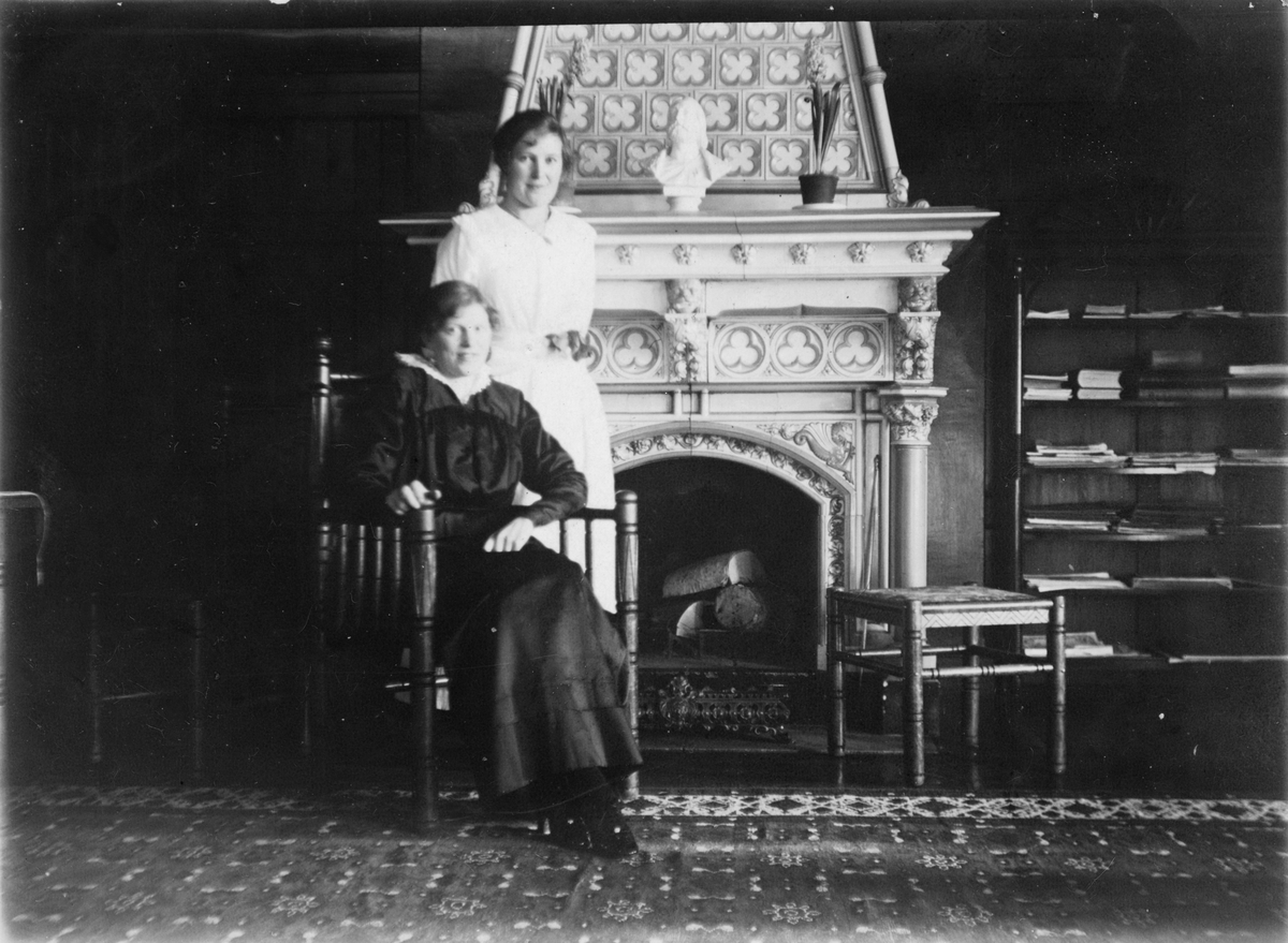 Här sitter Elna Brundin och bakom henne står Anna Larsson från Hemlinggrind. Miljön okänd.