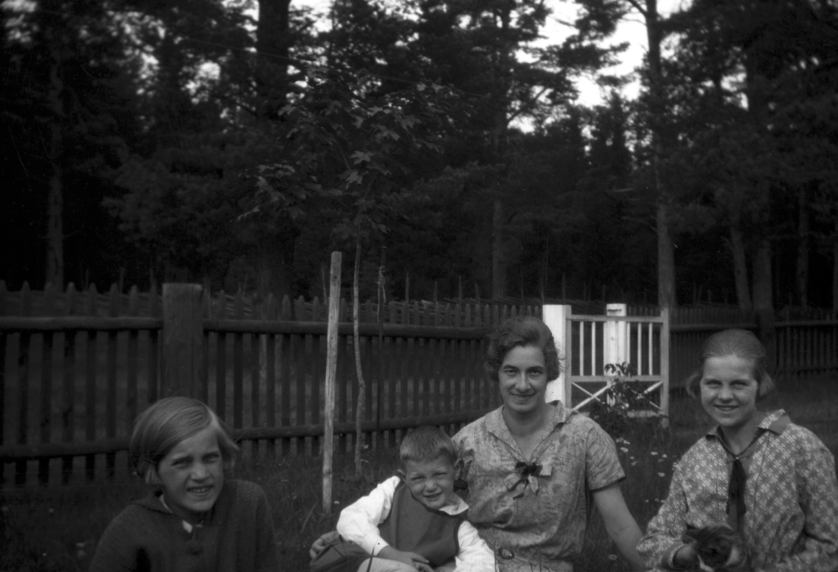 Här sitter barnen Brundin tillsammans med hembiträdet Gertrud 1929. Sören sitter i hennes famn, Eva till vänster och Ingrid till höger. Familjen hade en katt som hette Snurran, som sitter i Ingrids knä.
