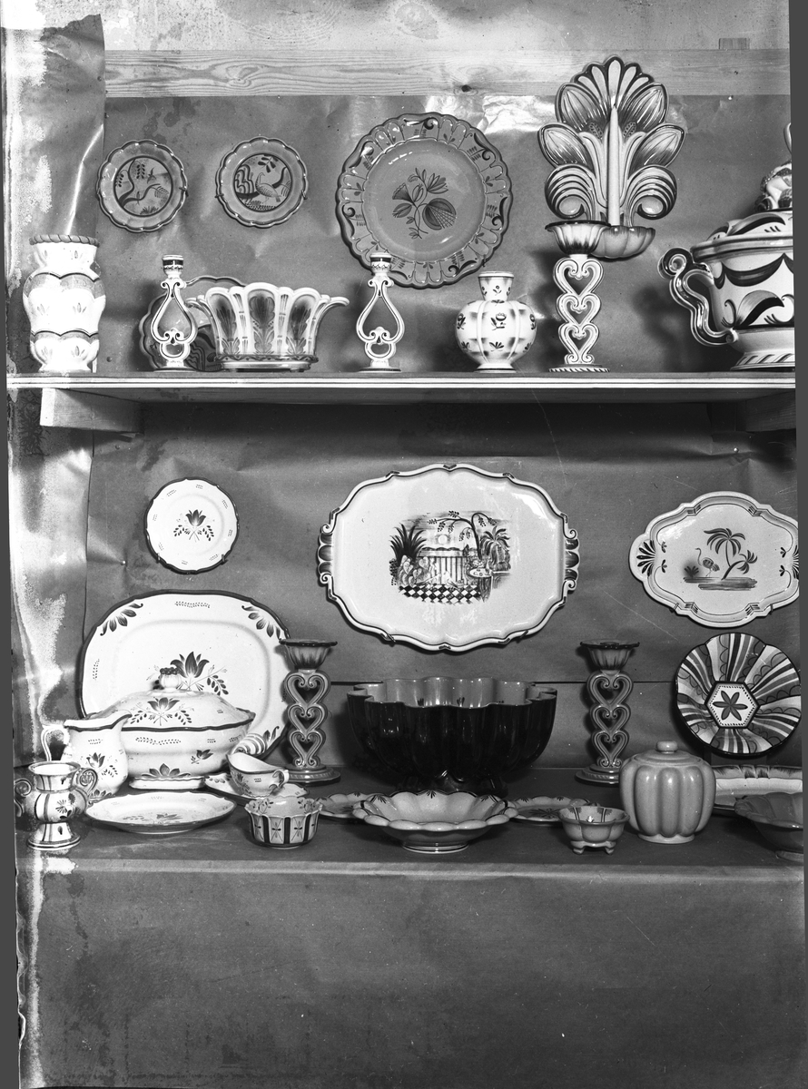 Utställda keramikföremål från Gefle Porslinsfabrik.