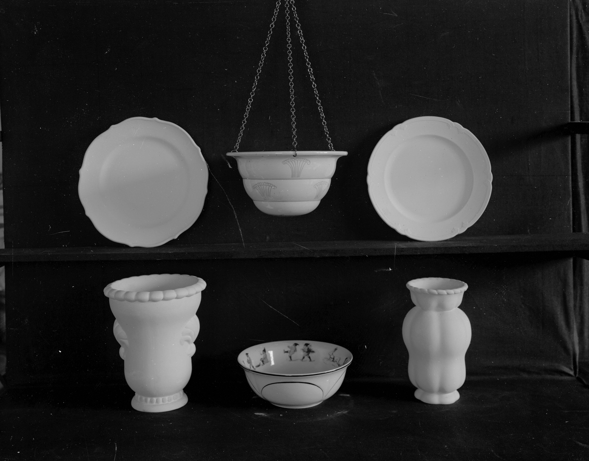 Ampel, vaser, tallrikar och skål med tomtemotiv från Gefle Porslinsfabrik