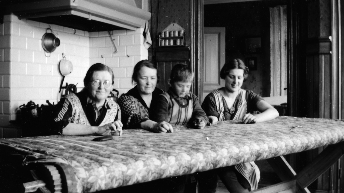 Östbloms kök. Här stickas det täcke. Elsa Ö. Sjöblom, Hanna L. Lundgren, Olle Sjöblom och Elsa Hägglund.
