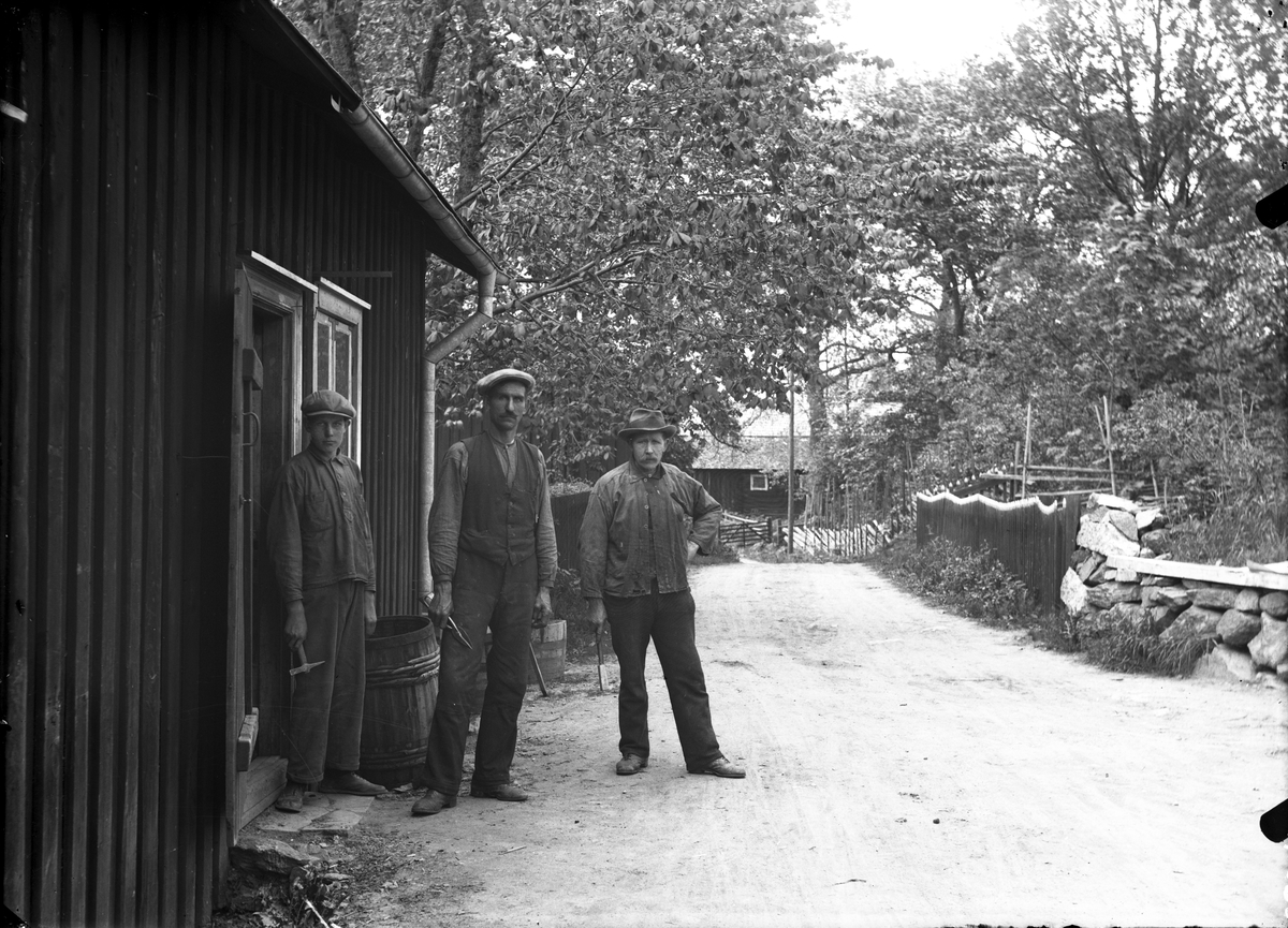 Plåtslagare Hans Olof Nordins verkstad. Nordin till höger, Einar Englund till vänster, i mitten "Sundsvalls-Olle" Frölin.