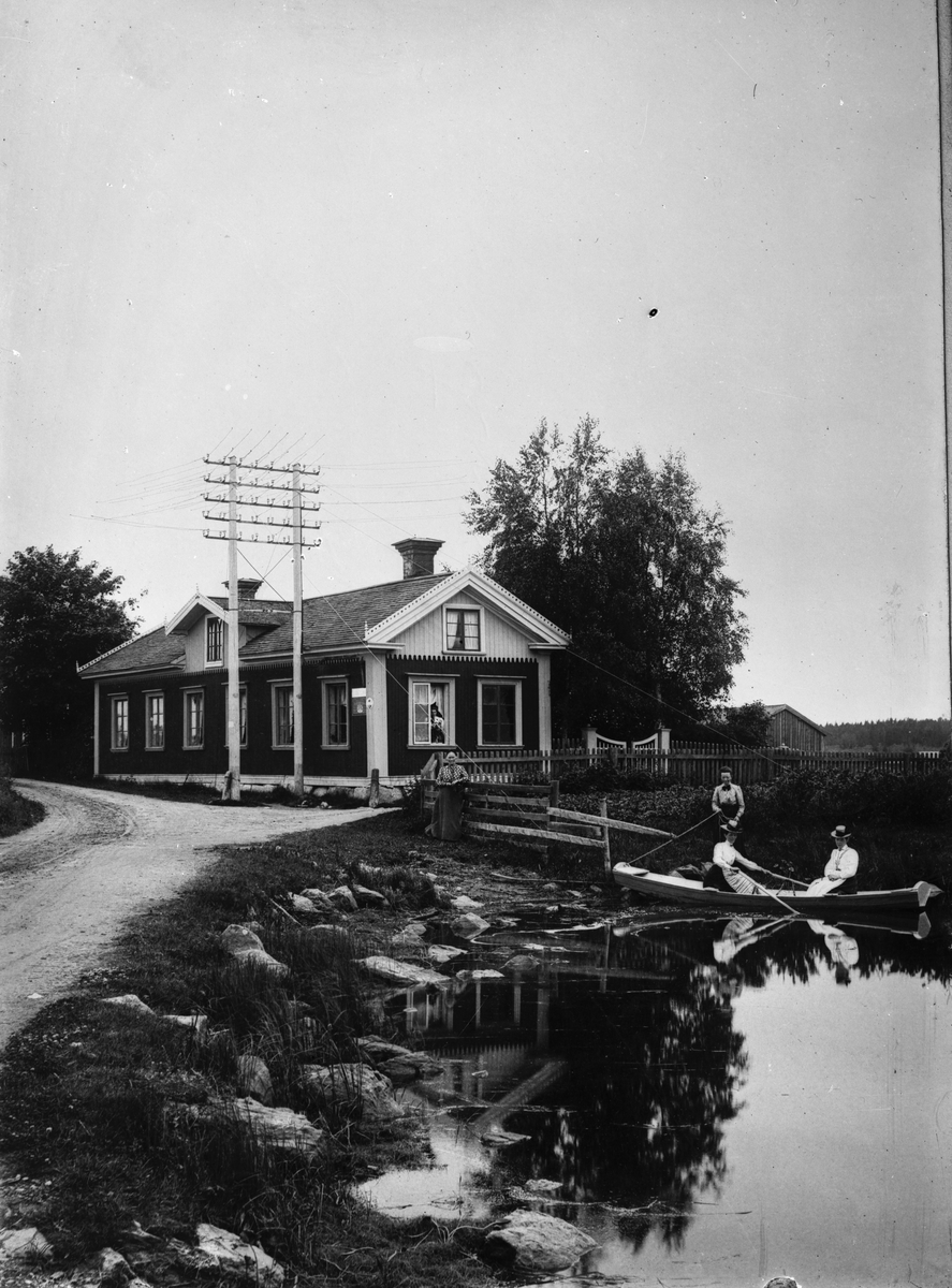 Clara och Helfrid i båten samt Laura Österberg vid sitt hem i Åbyn, Hamrånge. Eventuellt deras mor som står högre upp. Clara var lärarinna, Laura skötte Hamrånges första telefonväxel.