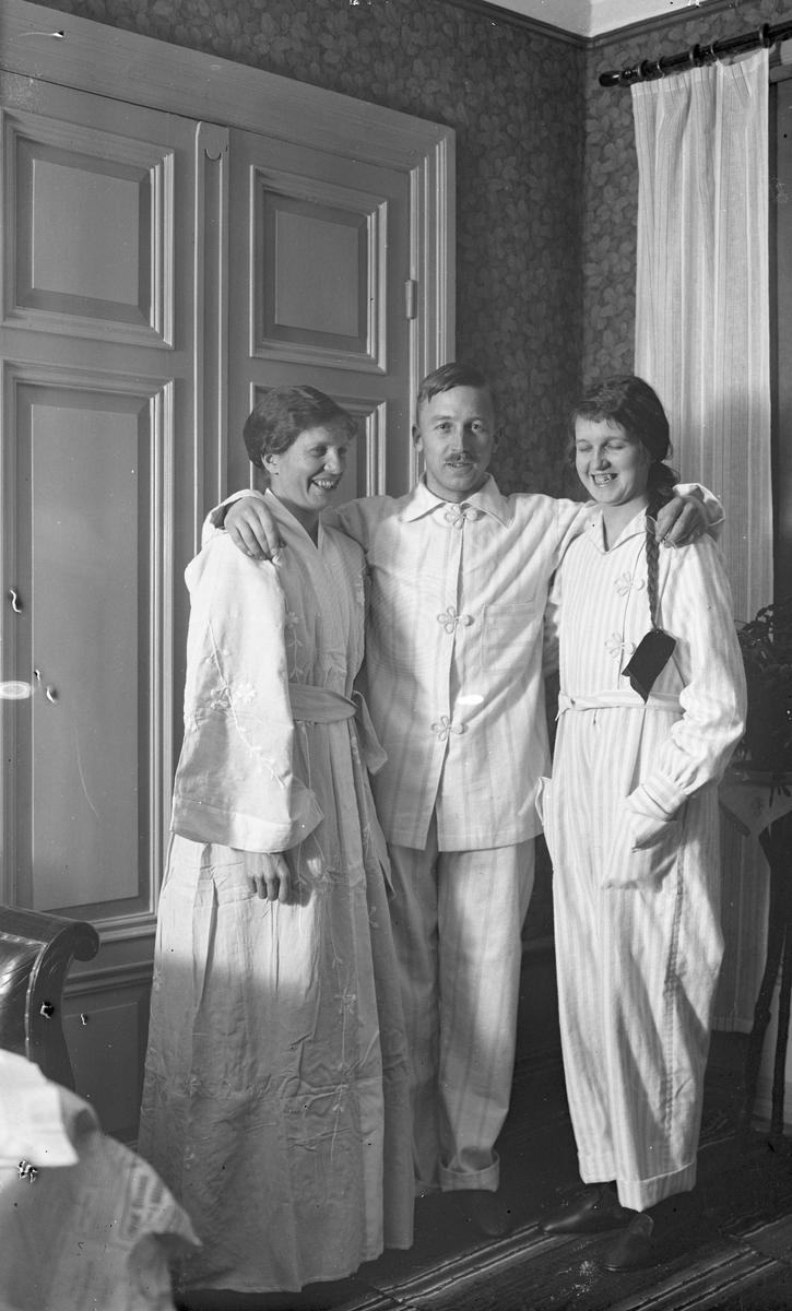 I pyjamas, syskonen Norling; Elin Maria, Helmer och Ester Elisabet.