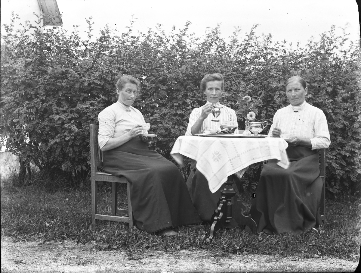 Tre kvinnor dricker kaffe utomhus vid ett bord.