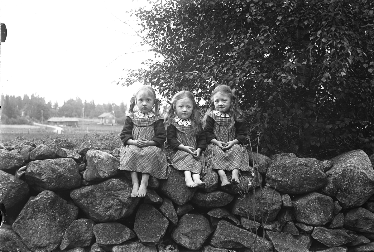 Tre små flickor på en stengärdsgård. Systrarna Aina, Brita och Anna Åberg från Kalvsnäs, Torsåker.