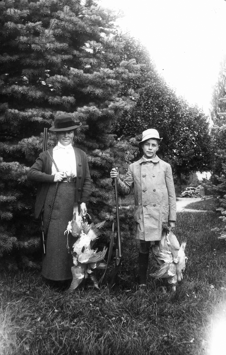 Fru Ella Bellander med sonen Sixten efter lyckad fågeljakt.