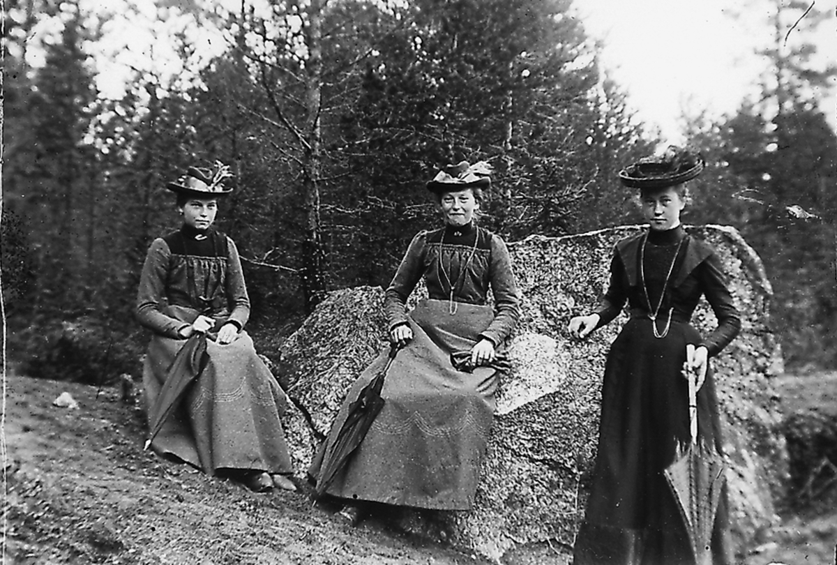 Tre kvinnor vid en stor sten.