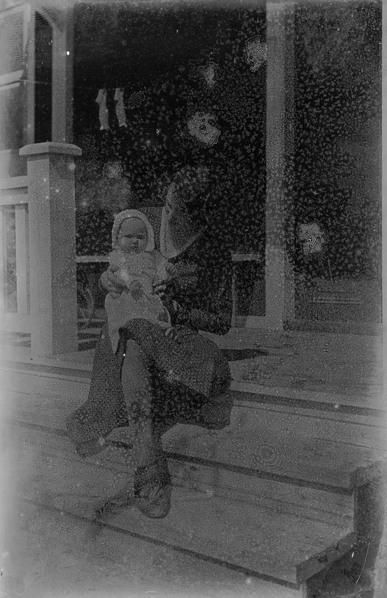 Kvinna med barn sittande på trappa.