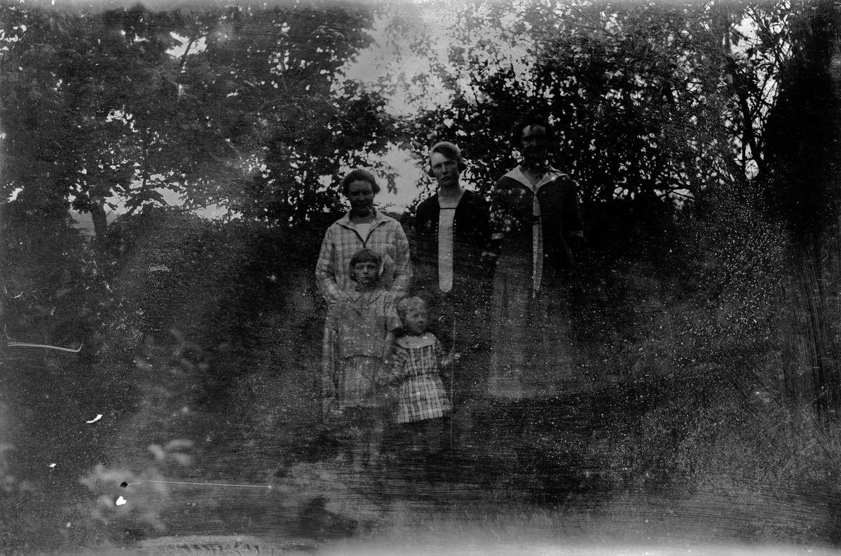 Tre kvinnor och två barn i trädgård.