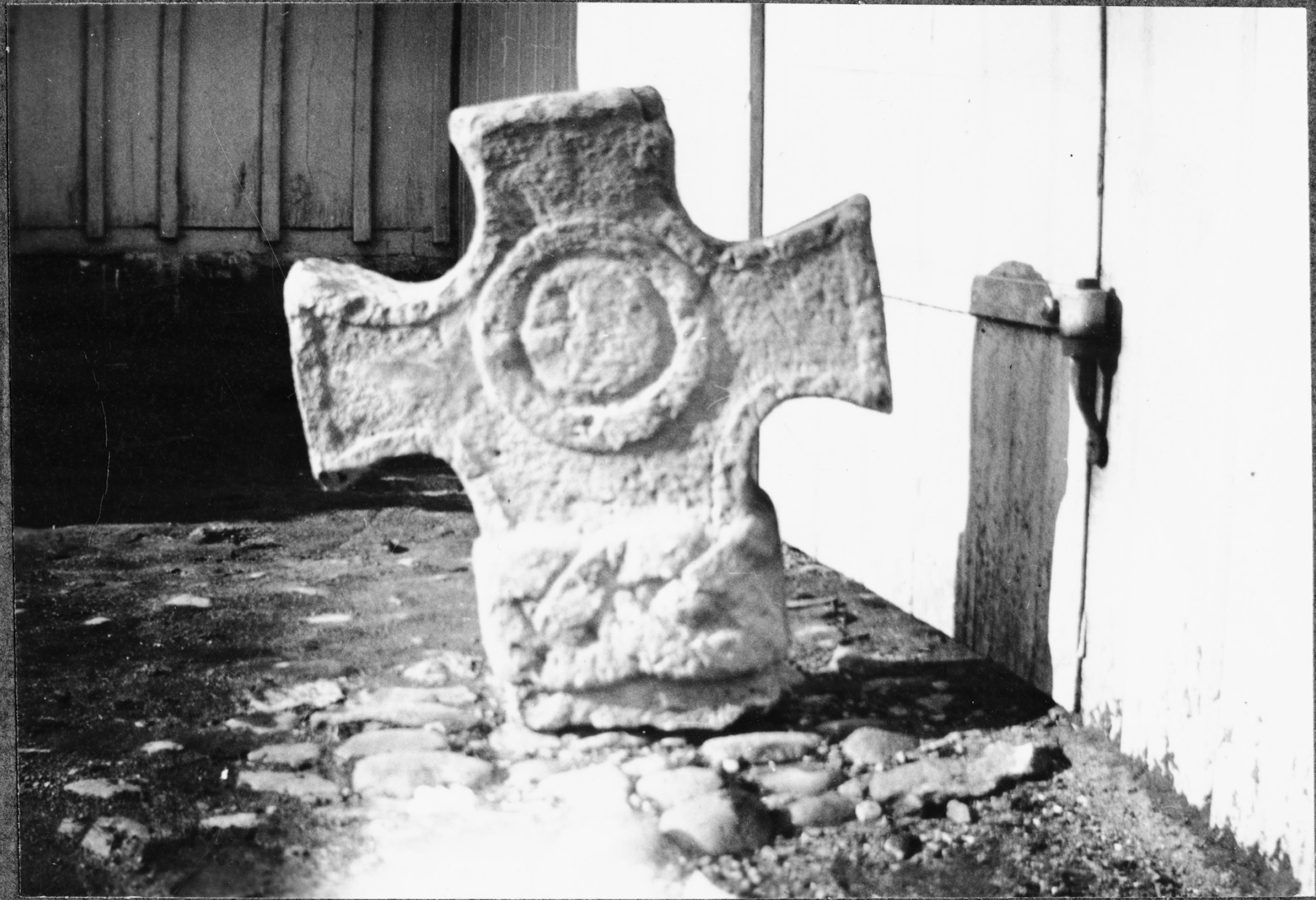 Sandstenskors, funnet på kyrkogården vid kyrkans södra långsida. Påträffades 1927.
