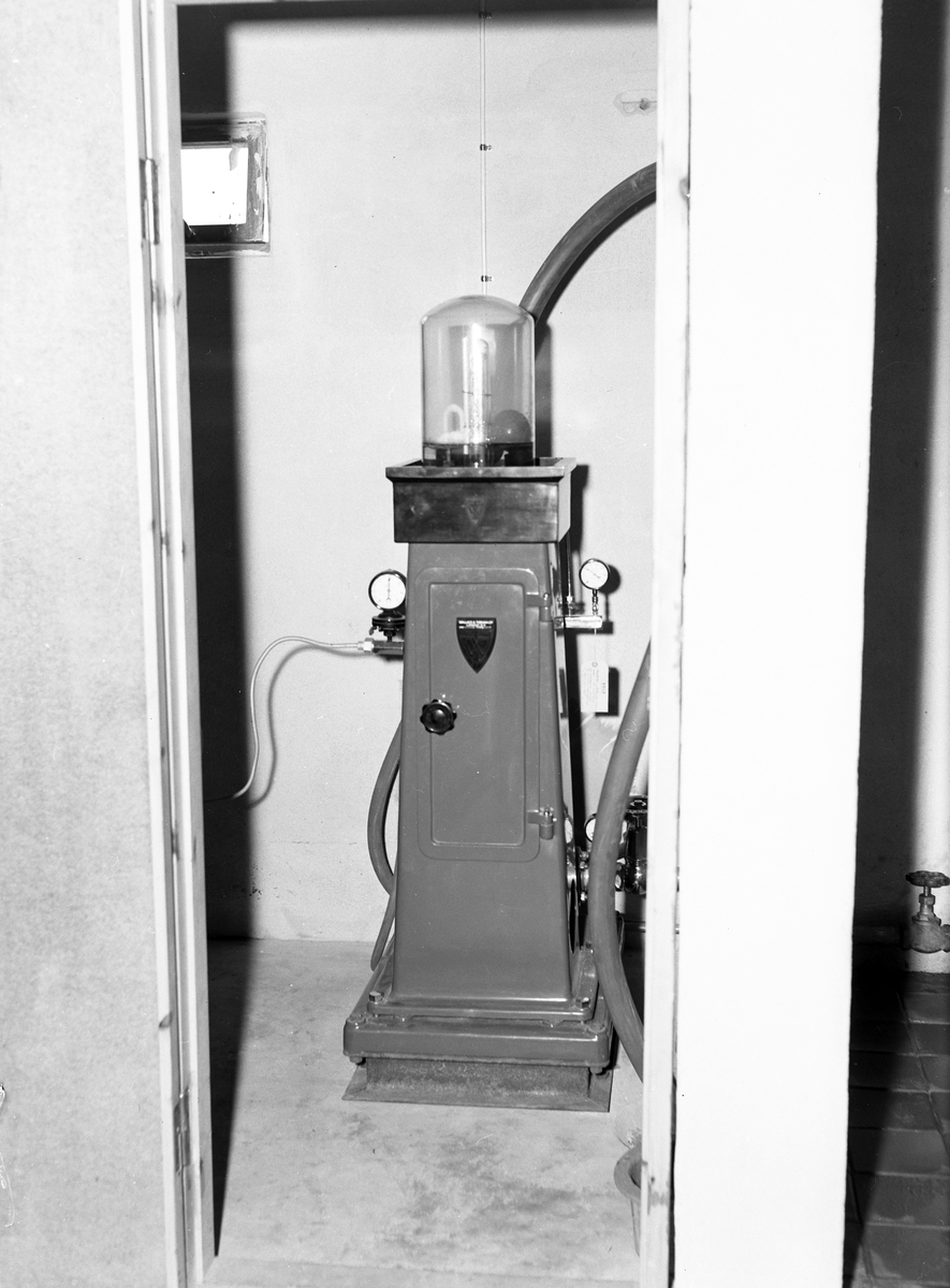 Vattenverkets nya reningsanläggning. Bilden visar en Silactor, tillverkad av Wallace & Tiernan. I apparaten bereddes aktiverad silika av klor och vattenglas. Aktiverad silika förbättrade flockbildning och sedimentation av partiklar. 7 juli 1951.