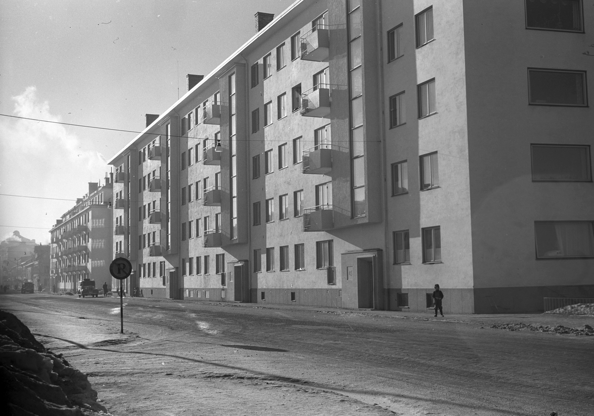 Stadsvy över nybyggda fastigheter på Norra Kungsgatan. 1948.