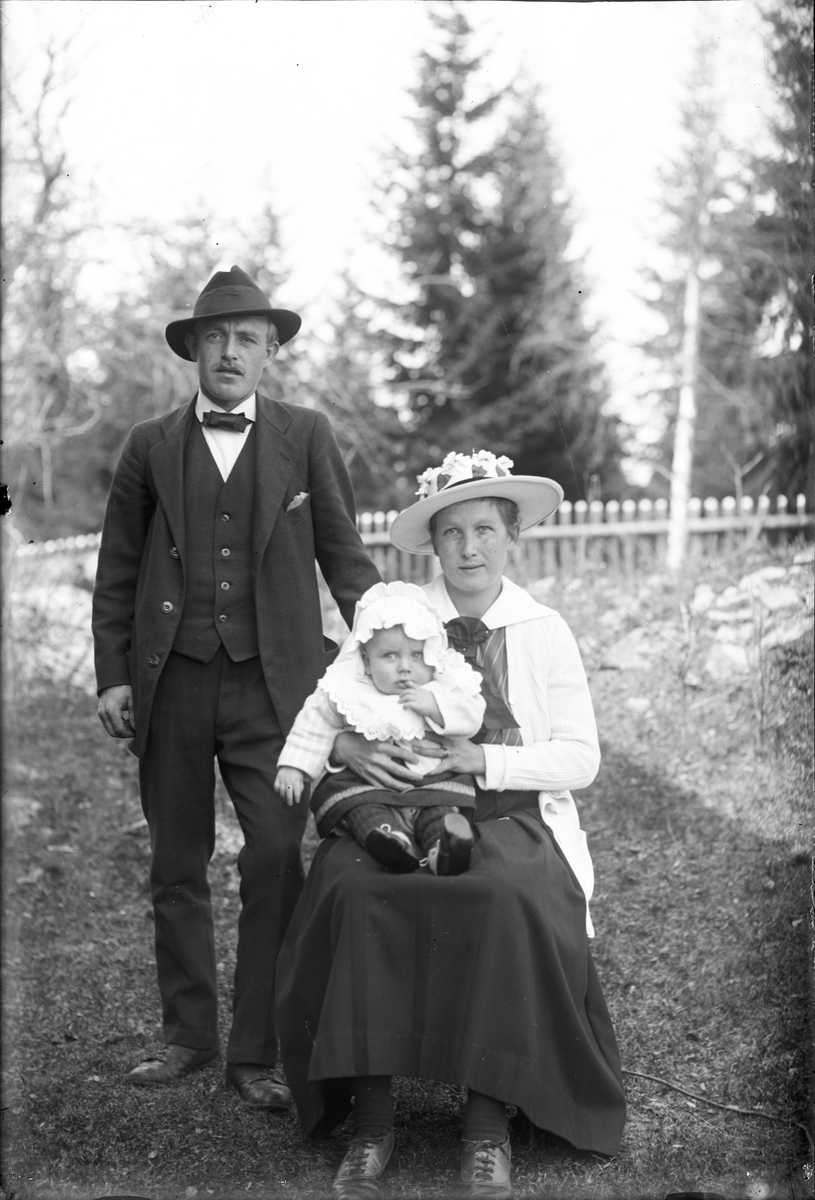 Familjeporträtt; man, kvinna och litet barn.