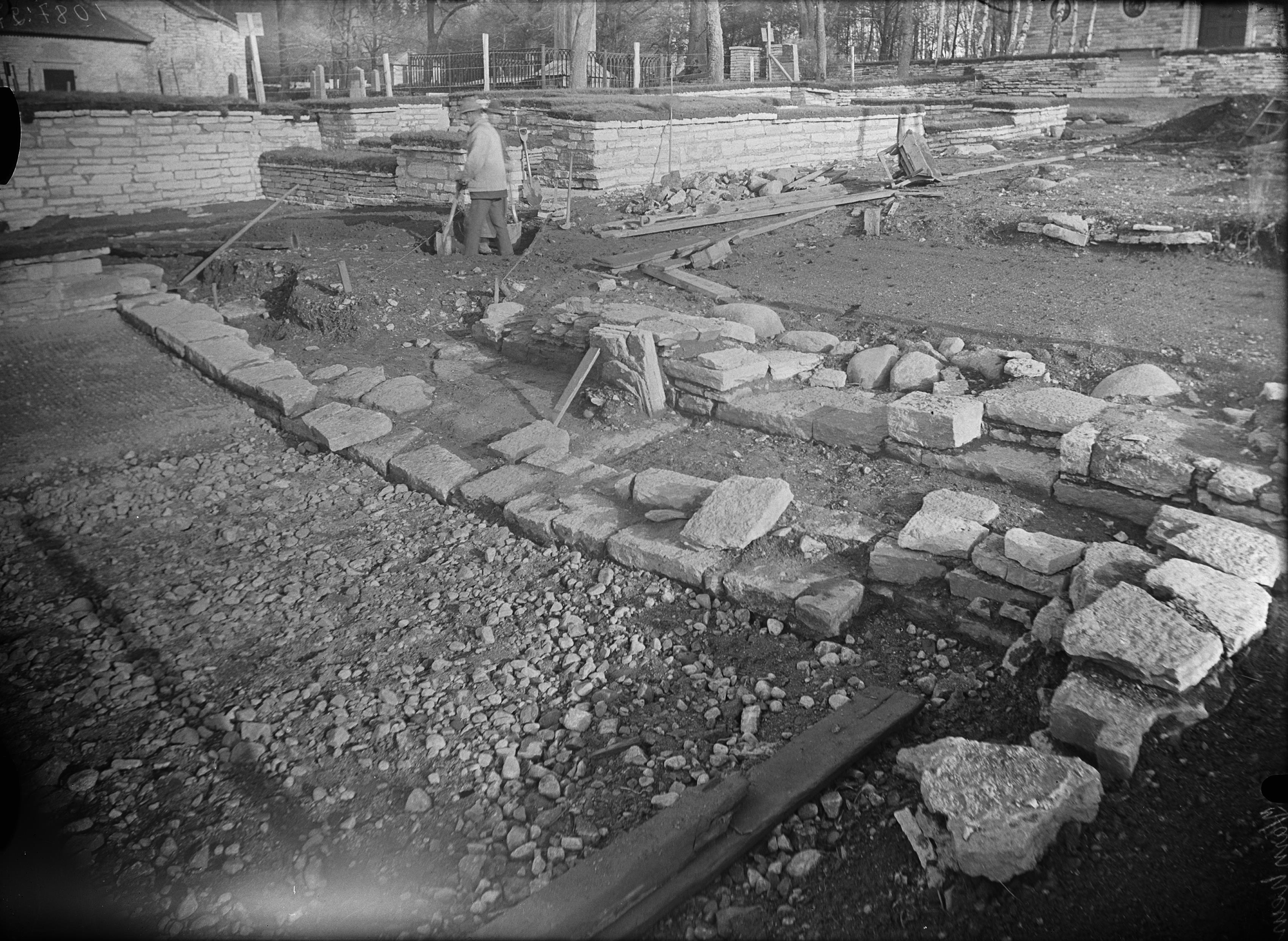 Byggnad söder om östra längan. Östra delen. Muren längst till höger är en yngre mur. Invändigt pågår arbetet med det nya golvet. Från sydväst.