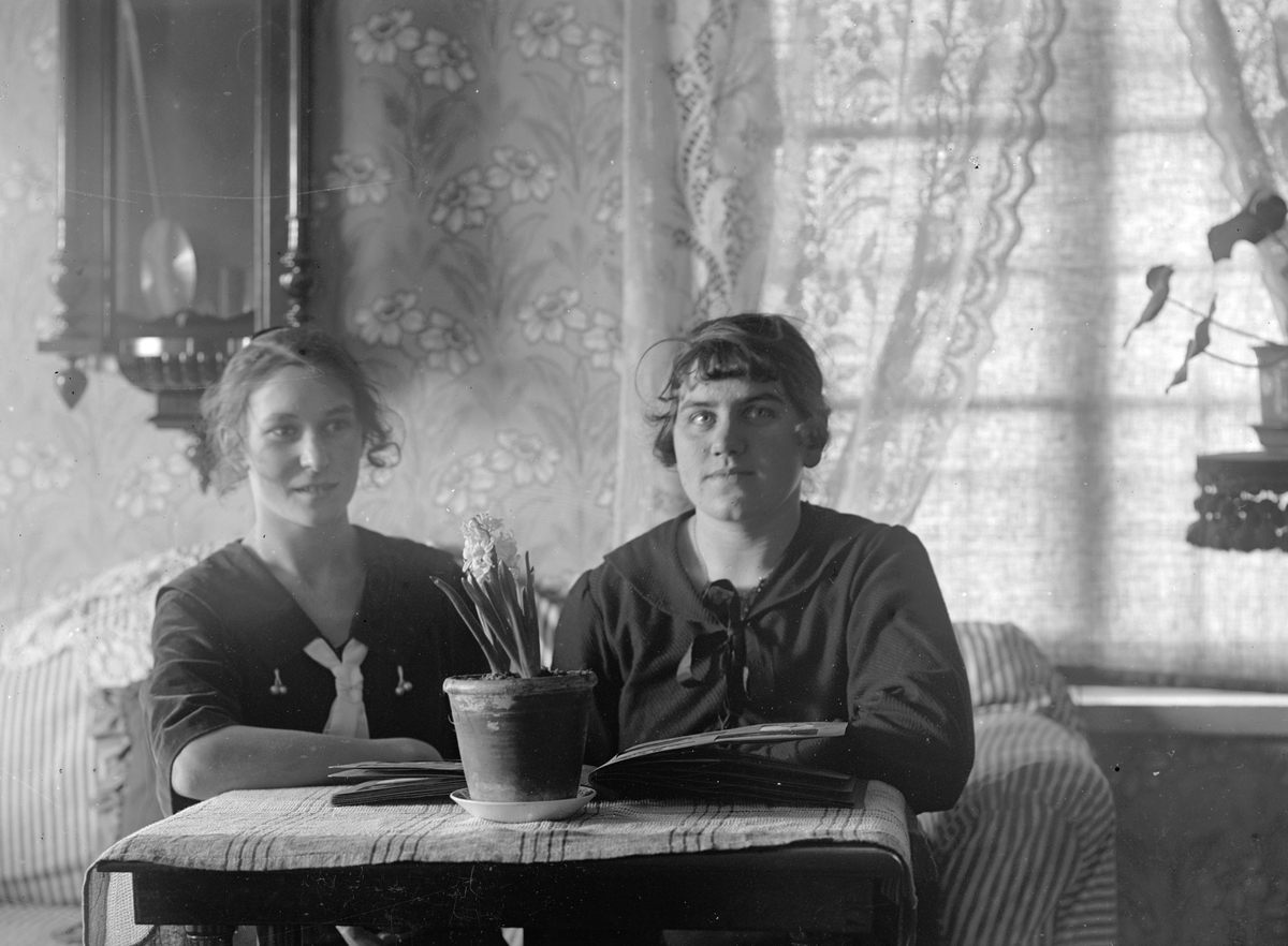 Två kvinnor tittar i ett fotoalbum.