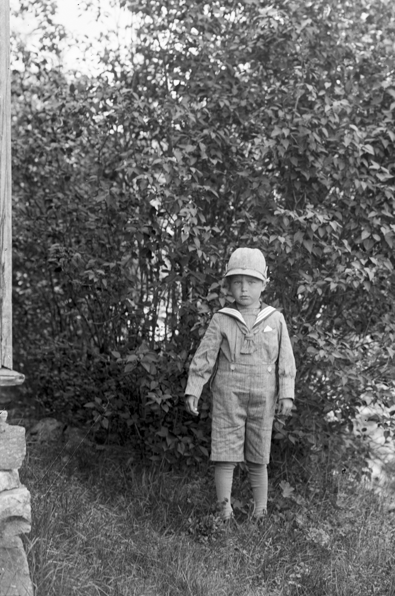 Liten pojke i trädgården.