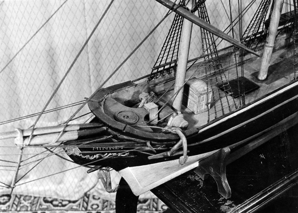 Modell av skeppet "Minnet". Skepp byggt av Gefle 1836, 249 sv. 143 nyläst, 493 ton. Redare: D. Elfstrand o Co Gefle.
