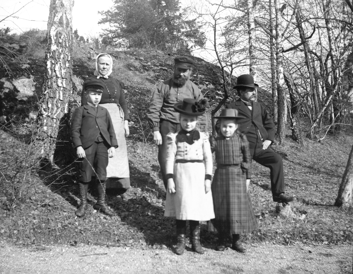 "I trädgården hos smedens på Hästholmen". Den 2 april 1899. Pappa Pehrsson, Farbror Olsson, Tant Olsson, Karl Pehrsson, Nelly Pehrsson och Anna Törnblom.