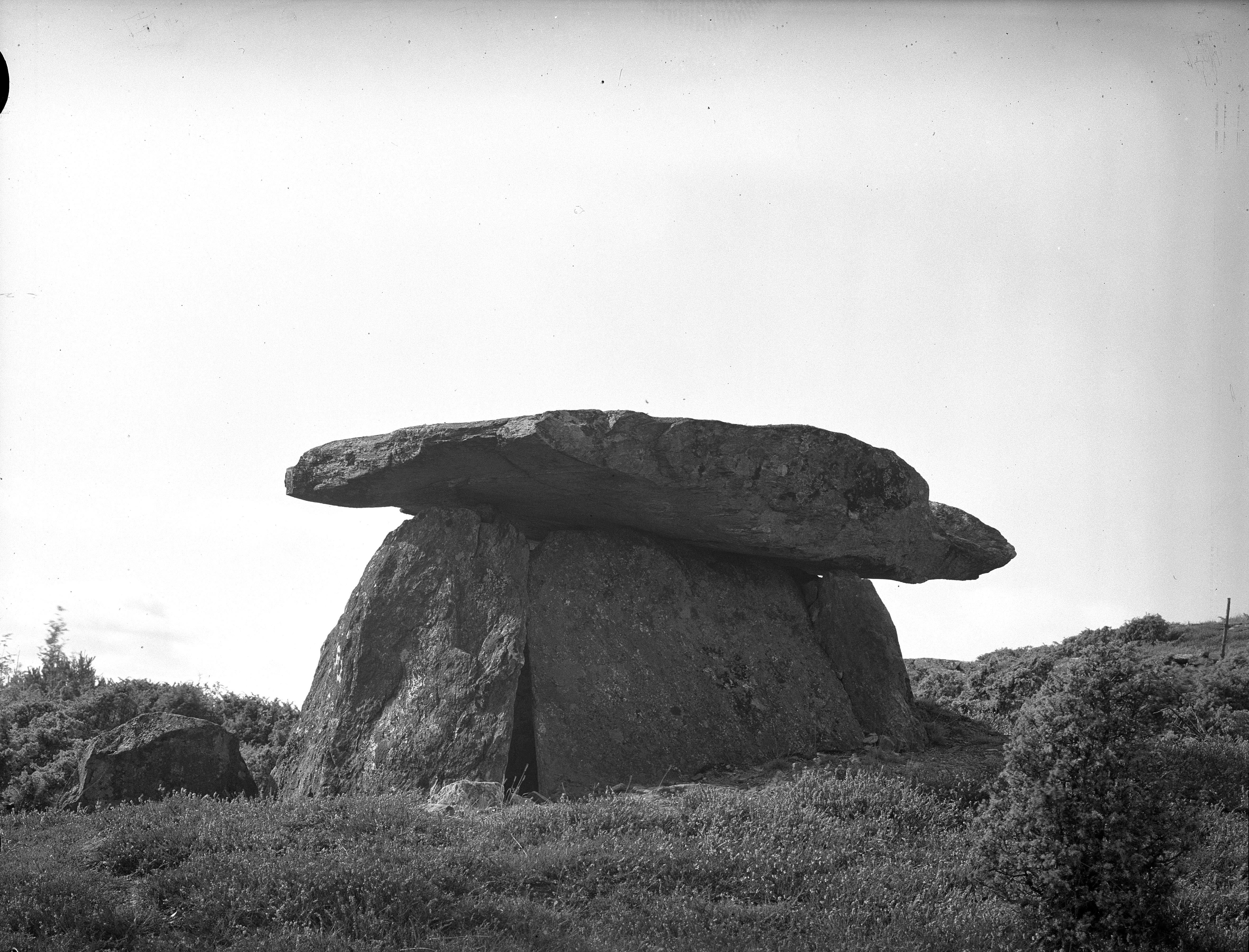 Beskrivning: RAÄ-nummer Stala 81:1. Dösen vid Haga, megalitgrav från tidigneolitikum. Den består av fyra resta hällar och en takhäll. Bilden troligen från mitten av 1940-talet.
