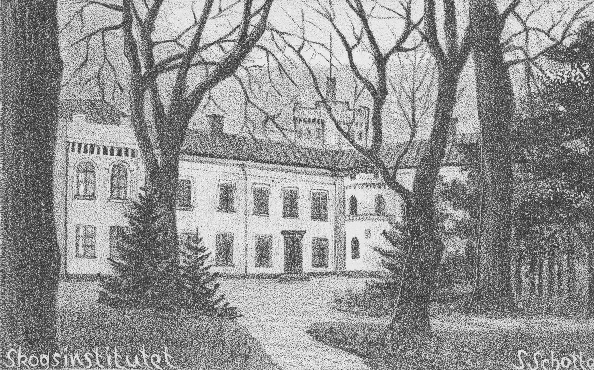 Teckning föreställande Skogsinstitutet av S. Schotte.