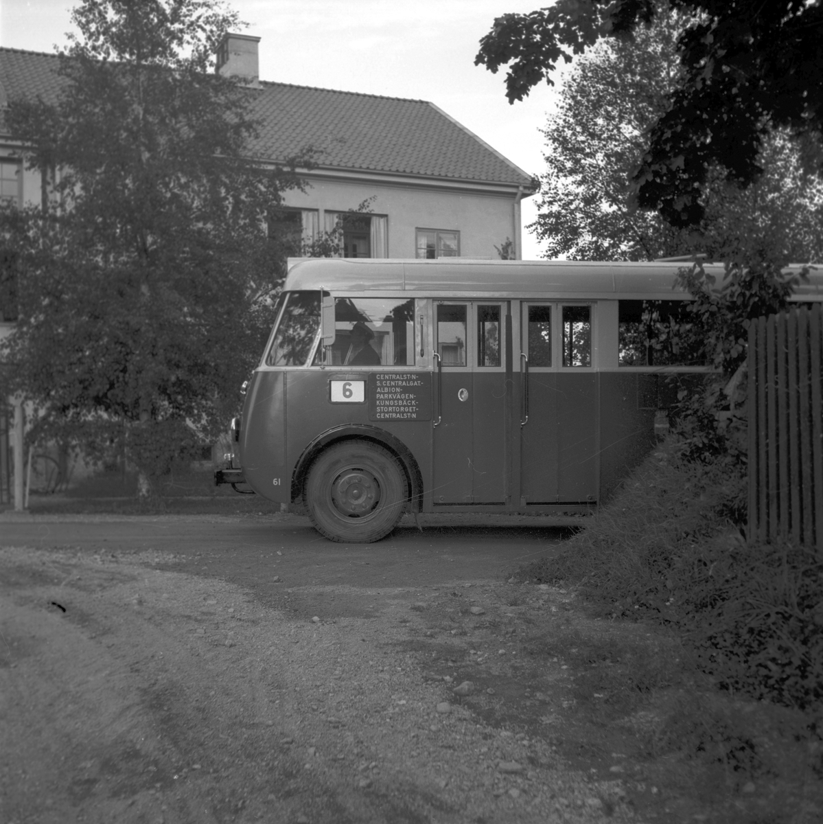 Nya busslinjer från invigningen. 25 september 1948. Busslinje 6 trafikerar Centralstation - Norra-och Södra Centralgatan - Albion - Parkvägen - Kungsbäck -Stortorget - Centralstation.