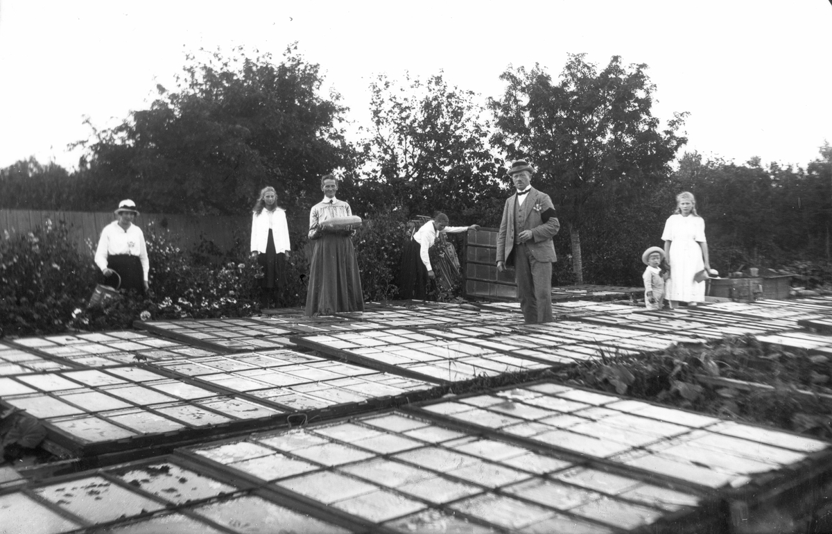 Trädgårdsmästare Eriksson med familj bland odlingar på herrgården. Från vänster: Anna, Tilda, fru Emma, Lisa, fadern N E, Sven och Emmy.