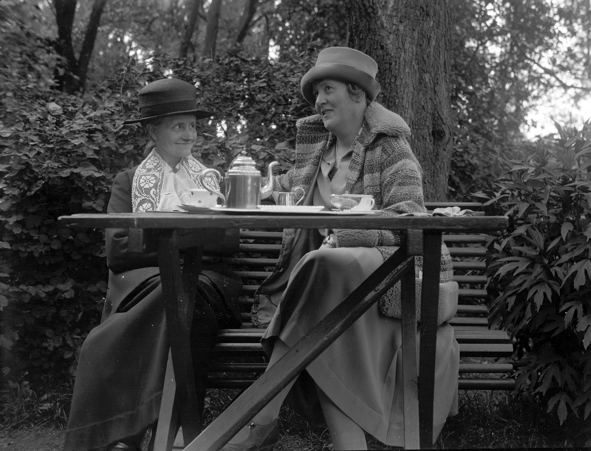 Hanna Olsson till höger underhåller sig med en okänd dam vid kaffebordet.