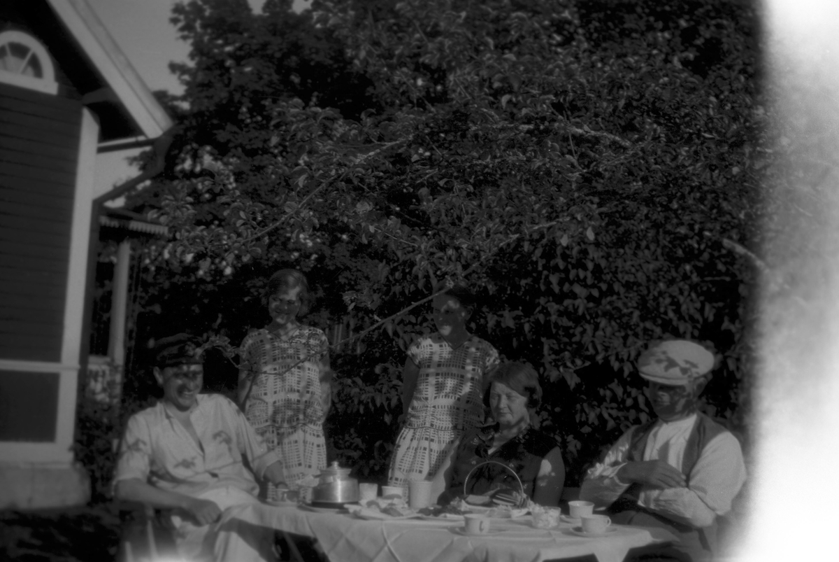 En bild från Brämen, besök av okända personer. Ingrid och Karin Brundin passar upp.