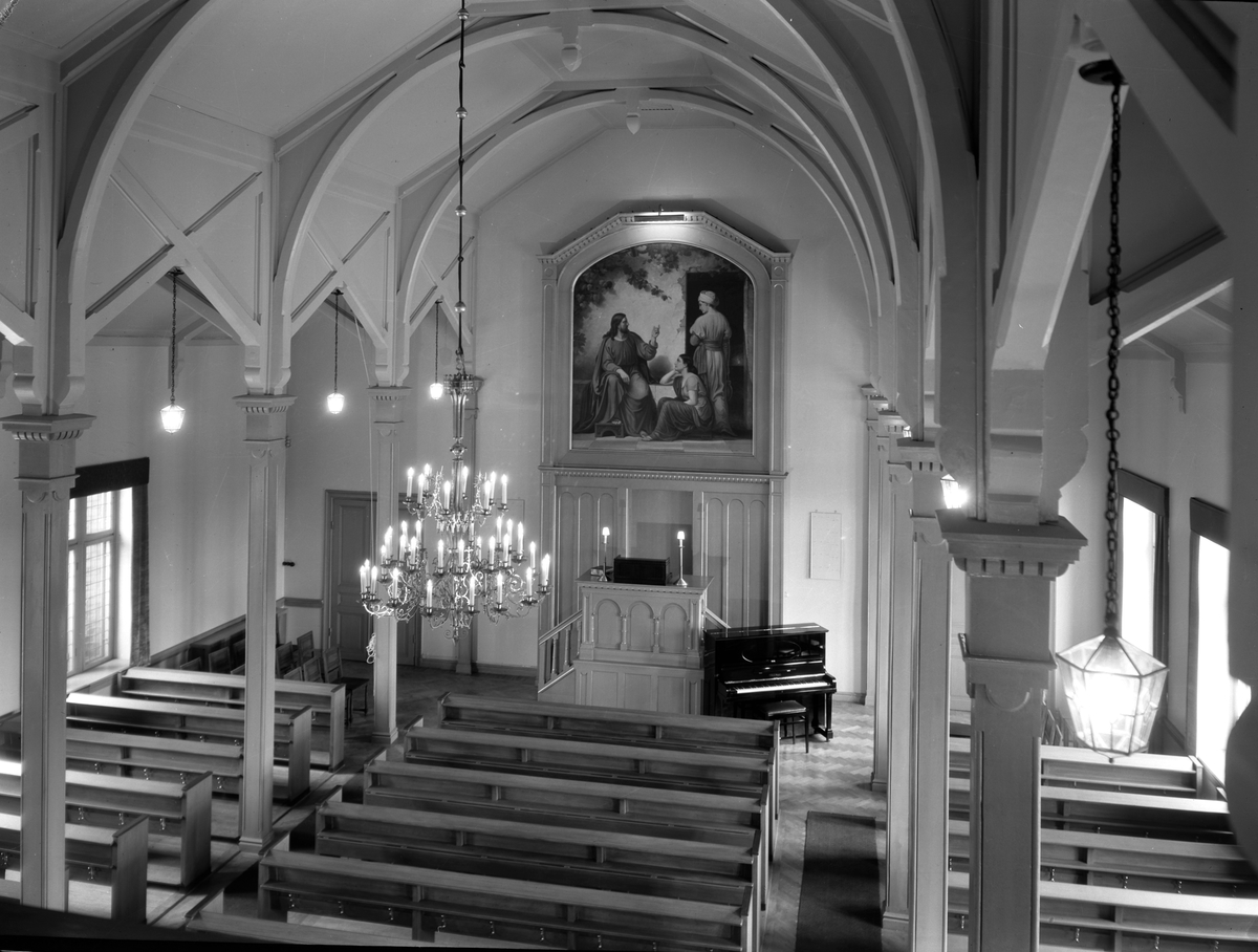 I vinkelbyggnaden inreddes en kyrksal med 300 platser.
