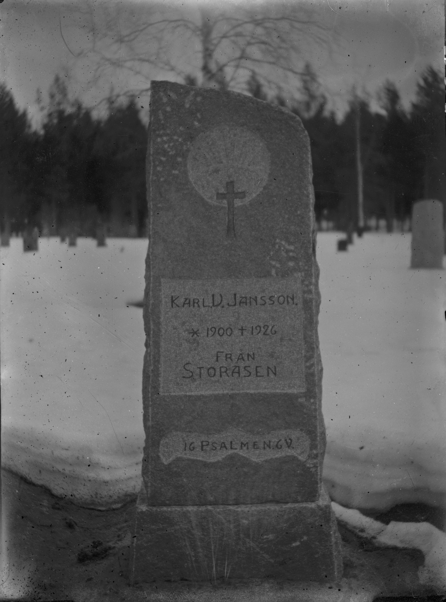 Gravsten med text "KARL D. JANSSON * 1900 +1926 FRÅN STORÅSEN"