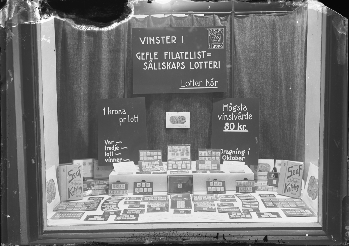 Gefle Filatelisällskap. Skyltfönster (frimärkslotteri). Foto 1930-tal.