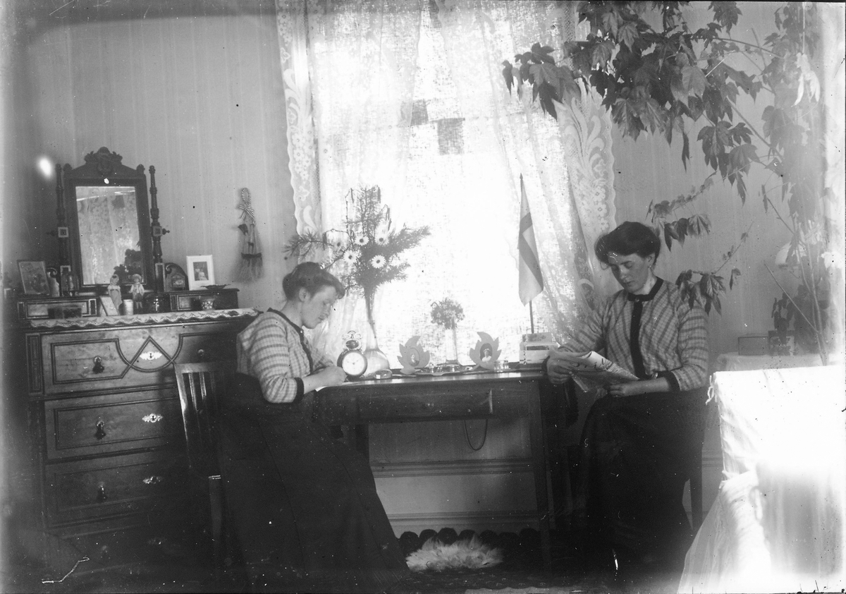 Rumsinteriör från "Pell-Pers" i Hå (s k herrstuga). Döttrarna i huset, Ingeborg till vänster och Anna till höger.