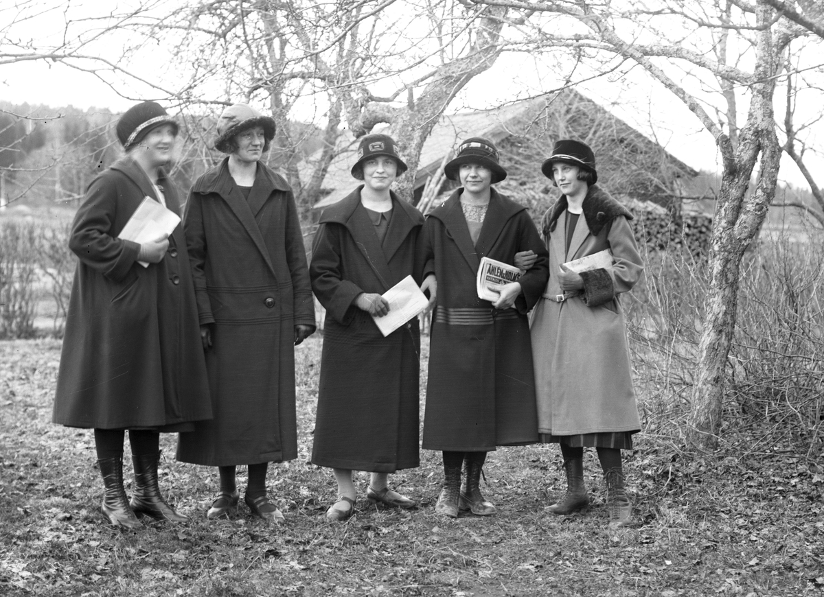 Fem unga kvinnor. Längst till höger Hulda Wikström gift Norberg, i mitten Skoglund.