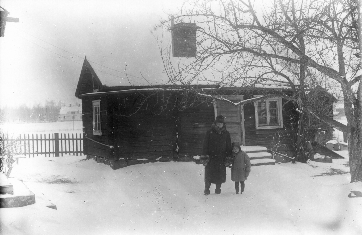Astrid Nilsson med sonen Lars. I bakgrunden bryggstugan ("brysstuggan").