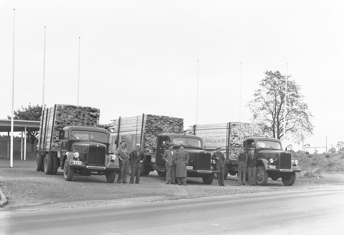 Den 28 oktober 1956. Bil & Buss. Lastbilar med bräder framför Travbanan.