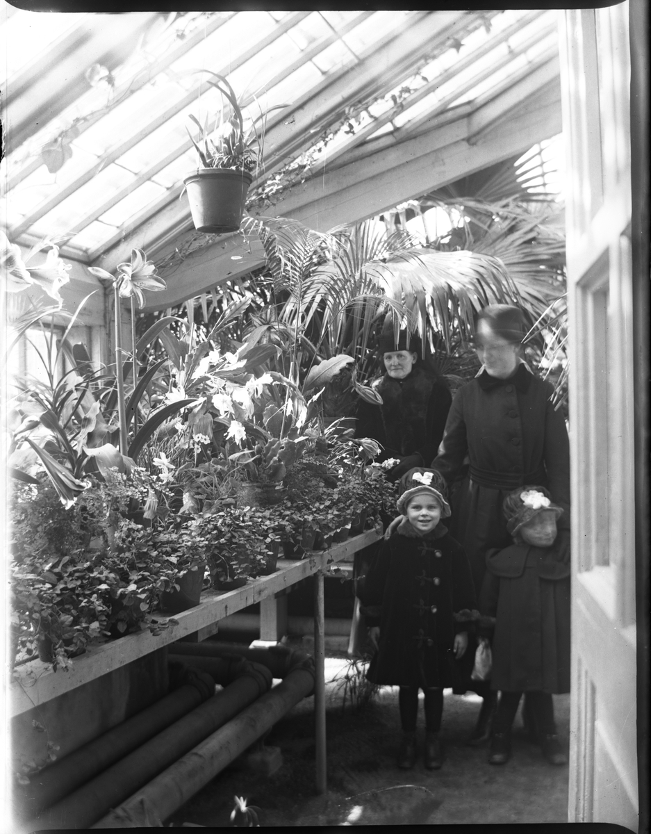 Elna Brundin till höger med sina döttrar Ingrid och Karin. Bakom Elnas mor Anna Larsdotter Olsson. Dom är i ett växthus, antagligen för att köpa en palm, som var väldigt vanliga i hemmen på den tiden.