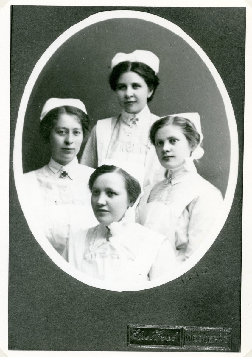 Sjuksköterskeelever och sjuksköterskor vid lasarettet i Stallhagen, 1915.