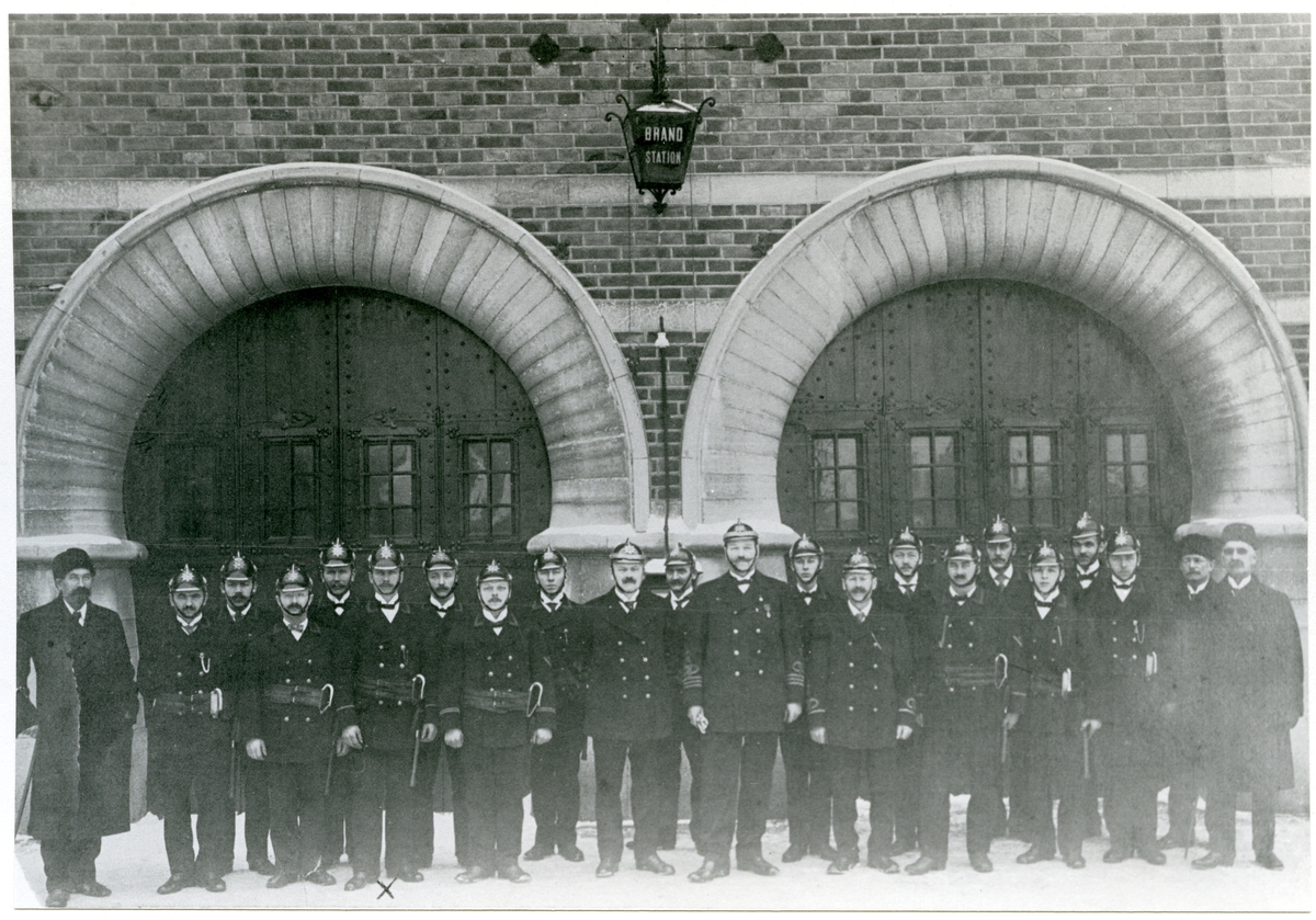 Personalstyrkan framför portalen till brandstationen, 1917.