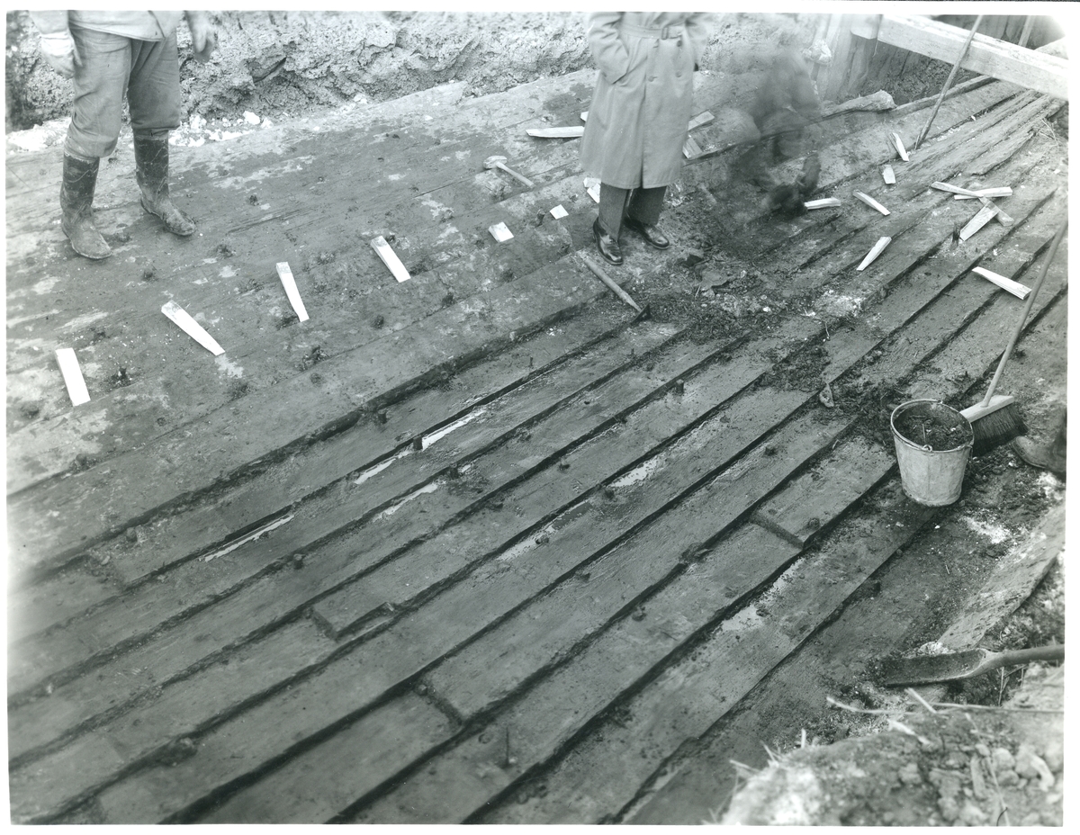 Arbetsbild från utgrävningen av båtfyndet i Gamla hamnen i Västerås, 1935.
