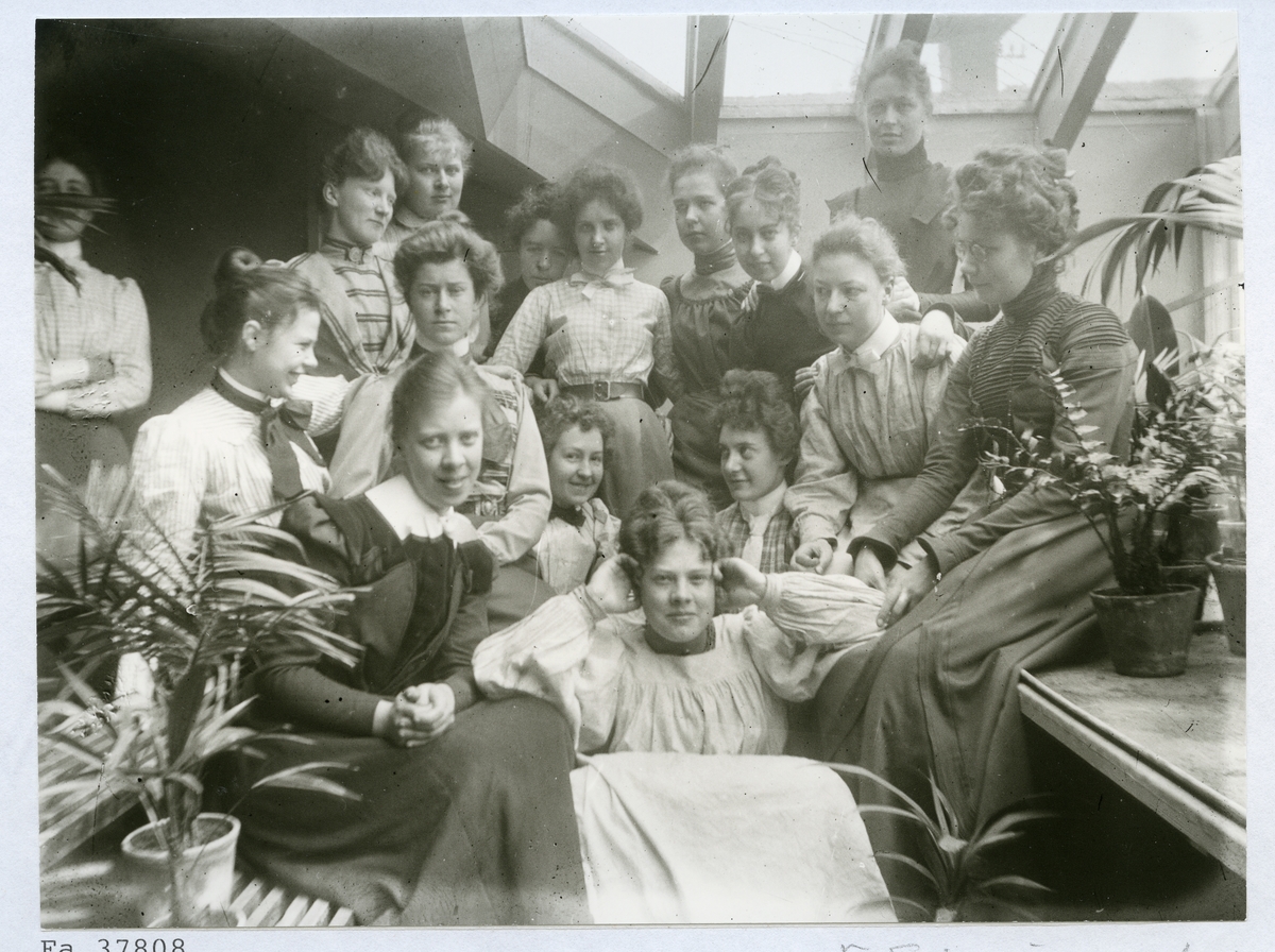 En grupp kvinnor sitter och står bland krukväxter. 1901.