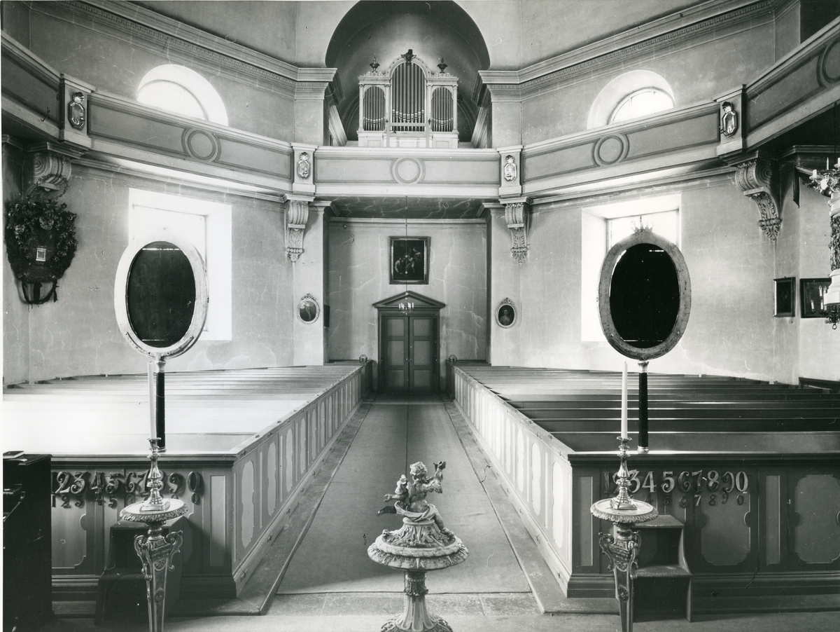 Interiör av Kung Karls kyrka, med Kyrkbänkar, orgelläktare, psalmtavlor m.m.
